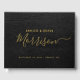 Simple chic gold calligraphy script bride and groom names wedding guest book with a modern luxury look on a black leather like background. +++++++++ Easy to personalize with couple's wedding details.