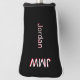 Colour shadows elevate this simple-looking cover for golf clubs by adding red shadowing to the name and monogram initials. We have used white, shadowed by red, for your three-initial monogram, at the upper end of the cover, and your name (first or last your choice) perpendicular to the monogram. While we've selected white piping, play around with the various colours to choose your personal favourite. A simple, non-serif font has been selected for the text on this custom golf club head cover that can be fully personalized as you wish. It is a wonderful, personal gift for your loved ones who enjoy golfing as a sport.