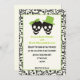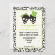 Elegant skulls Halloween green wedding invitation, featuring a black skull couple bride and groom on ivory background and a skull pattern border. The groom wears a green hat and the bride a green bow.