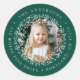 Add a festive touch to your holiday envelopes with our Elegant Snowflake Wreath return address labels. The holiday return address stickers feature your photo encircled by a wreath of white snowflakes and pine branches with a green background. Your last name and return address is displayed on the outer edge of the round holiday stickers.