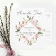 An elegant floral bouquet of pink peonies and ivory roses frame this lovely spring wedding Save the Date postcard. The sprigs of sage leaves decorate in the midst of the peach array of flowers that surround the beautiful modern typography. Personalize the wedding details on the back for your guests.