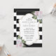 Invite your guests to your elegant black and white wedding party with these pink floral wedding invitations featuring pink flowers and greenery on a black and white striped background.