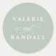 An elegant simple envelope seal sticker in subtle muted green with white text to personalize with the bride and groom's names. These seals add a nice personal touch to your wedding or event invitations.