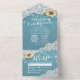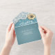 Modern Wedding Invitation with Detachable RSVP Postcard Template - Elegant Sunflowers, Vintage Lace Frame and Chic String Lights on Teal / Turquoise / Blue Green / Tiffany Blue Background.