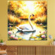 A serene water scene featuring a white swan on a lily pad pond, surrounded by autumn foliage. This relaxing nature composition showcases vibrant seasonal colours and reflects peace and harmony.