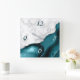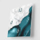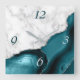 Elegant modern white marble and teal agate trimmed with faux silver glitter combine in this luxurious square wall clock. The numbers 3 and 6 appear in light silver grey on the agate background, while the numbers 9 and 12 appear in dark teal on the white marble.