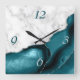 Elegant modern white marble and teal agate trimmed with faux silver glitter combine in this luxurious square wall clock. The numbers 3 and 6 appear in light gray on the teal agate background, while the numbers 9 and 12 appear in dark teal on the white marble.