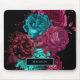 Elegant and stylish mousepad with teal and burgundy/red flowers on black. Personalized with your name. Perfect for your home office.