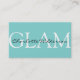 This stylish and elegant business card features a teal coloured background with elegant white and black text. The front of the card features a sample name printed in a beautiful black font over and enlarge, white text, sample word. The sample on this business card is "GLAM" which is suitable for a variety of beauty businesses. The back features the same teal coloured background with black text with the business or company contact information and services provided.