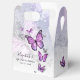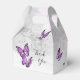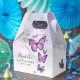 Create your own elegant purple butterfly favour boxes for any big day using a simple DIY template easily personalized with a name or monogram, celebration, a short message of love and thanks, and other custom text. The original art by Raphaela Wilson depicts a beautiful arch of silver and purple watercolor butterflies that have a unique floral pattern on their wings. These whimsical garden beauties flutter throughout this pretty fairytale themed design, and have a light drop shadow beneath to give them a cool 3D look. The background on these cute template favour boxes might be a soft silver grey stone texture with an etched rose and sparkle glitter, but you can change the hue to any colour of the rainbow. The magical, once upon a time theme complements beautifully with butterfly weddings, a lavender quinceañera (XV), light purple sweet 16 birthday party, Cinderella princess baby shower for a girl, lilac bridal shower, among other special moments. By customizing the girly design further, additional creative options in champagne yellow gold can be uncovered, and feel free to switch out the chic script calligraphy and modern fonts to a typography style that best suits you. Give guests who've helped make your big day come to life a show of gratitude with personalized thank you favour boxes. Enjoy! Category: personalized box for candy favours with butterflies; 15 years old quinceanera favour boxes; purple monarch butterfly wedding favour boxes for her / mis quince anos. Purple butterfly party theme colours: amethyst, dusty light purple, lilac, lavender, ultra blue violet pastel, light grey, dark grey, faux metallic silver, black and white.