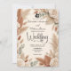 Invite guests with warm earthy tones, watercolor pampas grass, cream roses, and classic calligraphy set against a rustic printed paper grain background.This botanical layout features a warm, earthy color palette highlighting a simulated muted tan and soft rust-orange floral arrangement. The visual hierarchy centers on graceful cursive script, which is framed by watercolor illustrations of dried palm fronds, cream-toned roses, and sage green foliage. The background relies on soft, diffused shading to simulate a rustic, tactile finish. Please note: This is a flat printed image with a printed paper grain effect, not actual raised material.