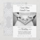 These elegant wedding invitations, featuring a classic black and white photo image of the hands of the bride and groom cupped into a heart shaped embrace, is a lovely reminder of your love and new bond. The editable script typography combines both traditional and modern fonts. Susi Inc. A beautiful choice for a more formal style, but with its clean simple layout still feels modern, chic and trendy. The reverse side shows an intricate floral pattern similar to the delicate details of her wedding gown on the front of card. Match the theme of your wedding from our Elegant Black and White Photo Wedding Suite, so you have a lovely unified look that ties everything together.