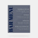 Panneau de menu de barre de mariage acrylique avec typographie gris et bleu marine imprimé sur fond bleu foncé transparent. Panneau de menu transparent foncé imprimé sur acrylique avec fond bleu foncé transparent, menu de bar écrit le long du côté en bleu marine, et le menu lui-même en polices grises élégantes.