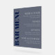 Acrylic wedding bar menu sign with grey and navy blue typography printed on a transparent dark blue background. Dark transparent bar menu sign printed on acrylic with a transparent dark blue background, bar menu written along the side in navy blue, and the menu itself in elegant grey fonts.