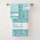 Ce bel ensemble de serviettes de bain présente différentes nuances de bleu turquoise, turquoise et blanc dans une abstraite motif en cachemire. Chaque serviette est un design légèrement différent, mais coordonné pour s'accorder parfaitement. Vous pouvez les personnaliser avec votre nom de famille ou votre prénom. Il y a aussi d'autres articles assortis disponibles pour créer une salle de bain luxueuse et entièrement coordonnée.