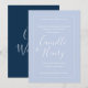 White elegant type on a sweet periwinkle blue background on the front and dark blue background on the back, perfect for a modern or traditional wedding. This design is also available in other colours in my store.