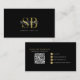 This business card design features a sleek and professional black background with elegant gold and white accents. The front showcases large gold initials subtly in the background, with the name and title centred in clean, sophisticated fonts for a high-end look. The back maintains the same colour scheme and includes a prominent QR code on the left, while the right side neatly organizes contact details with modern gold icons and white text. Overall, the design combines classic elegance with modern touches, creating a polished and upscale impression perfect for a marketing consultant or similar professional.
