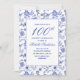 Elegant vintage/antique blue floral on white 100th birthday party invitation for women. Contact me for assistance with your customizations or to request matching products.