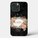 "Elegant Vintage Floral Pink Black Script Monogram iPhone 13 Case." Elegant vintage botanical floral bouquet frames your name and monogram over a black tone-on-tone damask pattern background. Created by internationally licensed artist, Audrey Jeanne Roberts, copyright.