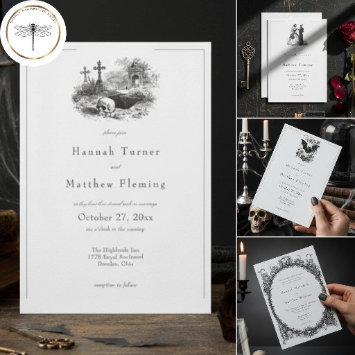 Elevate your special day with this elegant vintage gothic design with its vintage eerie black wedding cake on front and gothic skeleton bridal couple on the back. This unique black and white wedding response card with dinner choices is perfect for couples seeking a sophisticated, classic, or dark aesthetic for their memorable celebration. Fully customizable, it sets a dramatic, vintage aesthetic and darkly romantic tone for your ceremony. Created by Simply Farmhouse Press.
