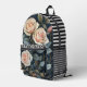 Step into timeless style with this Elegant Vintage Roses Personalized Backpack. Featuring soft blush and ivory roses against a deep midnight blue backdrop with striking black-and-white stripes, this backpack blends romantic charm with bold contrast. Your name or custom text is subtly showcased on the front pocket, making it uniquely yours.