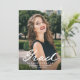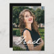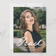 Celebrate your graduate’s achievement with this elegant and personalized graduation party invitation. The design showcases the graduate’s vertical photo, with “Grad” elegantly displayed in a white handwritten script overlay for a sophisticated touch. Customize the front with the graduate’s name, school, and class year, while the back features all the essential party details. A hand-drawn bow and vintage handwritten script add a timeless charm, making this invitation perfect for high school and college graduates. Set the stage for a stylish and memorable celebration!