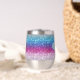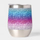 Ce verre à vin a un joli arrière - plan à faux parties scintillant bleu, violet, rose et argent qui complète particulièrement la finition en acier inoxydable. Au centre se trouve votre nom en bleu assorti sur un ovale gris argenté avec une bordure bleue. Elégant et festif !
