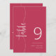 This elegant wedding table number features an elegant calligraphy and simple sans serif typography font for a clean minimalist and modern look in a viva magenta background, which is a beautiful way to help your guests find their seat/table. The simplicity of this design adds a touch of elegance to your wedding. It works well with many wedding themes and definitely a great addition to your wedding stationery. Just customize the names. wedding/event date, and table number in a few easy steps and personalize it to give it a nice personal touch.
