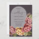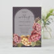 Elegant watercolor flowers in pink and gold with beautiful greenery on a dark purple brown background and your wording in chic lettering on a transparent arch. MATCHING items in our collection.
