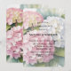 This elegant wedding design features beautiful watercolor hydrangea blooms in soft shades of pink, blush, and delicate white, with a hint of blue, surrounded by lush green leaves. The romantic floral arrangement creates a timeless and sophisticated look that is perfect for wedding invitations, bridal shower stationery, rehearsal dinner invites, or other wedding celebration décor. The soft watercolor style adds a graceful garden-inspired charm, making it ideal for spring and summer weddings or any couple who loves classic floral elegance.