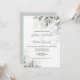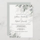An Elegant Watercolor leaves Wedding Invitation designed with a cluster of green leaves on a white background with dark text and gold accent. The front text includes: Together With Their Families, The Bride and Groom's Full Names, The Wedding Date and Time, The Location Name and Address, and Reception Note. The reverse side text includes: RSVP and your Details on a matching soft green background with black text and decorated with a cluster of green leaves. To personalize, simply insert your text into our easy template, replacing the sample text.