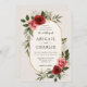 Vintage inspired elegant wedding invitation design featuring watercolor roses in red and pink with muted green foliage. The neutral colour scheme is not only a great choice for weddings for all seasons, but especially fall.