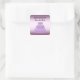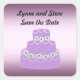 A pretty purple cake with white decorative icing and white flowers with green centres. A shaded background of mauve and white. Customize with names and date as desired.