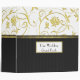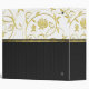 Elegant wedding planner or guest book done in a lovely gold on white fleur style flourish design, on the top half of the binder. A striped damask look, in black, covers the bottom half of the binder and a antiqued looking gold border separates the top from the bottom. The front has a squared off text area ready to personalize for your wedding needs. Purchase what ever kind of inserts you need from your local discount or office supply store.