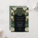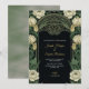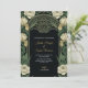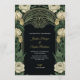 Elegant wedding invitation with a dark background, ornate floral border in green and cream tones. Text in gold cursive conveys a formal, classic tone.