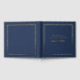Introducing our elegant and formal wedding keepsake guestbook, crafted with real gold foil on a navy blue background. This luxurious guestbook features a sophisticated contemporary minimalist design, highlighted by a double frame border in gold foil. Personalize this exquisite wedding accessory with your details in chic lettering and script. The spine is blue and is adorned with gold foil, customized with the couple’s first names and wedding date, adding a personal touch to your special day. The back of the book mirrors the front with two matching gold foil frames, creating a cohesive and stylish look. For added versatility, you can easily change the foil to silver or rose gold, ensuring it perfectly complements your wedding theme. This guestbook is not only a beautiful keepsake but also a timeless addition to your wedding celebration.