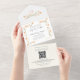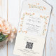 This design features an all-in-one wedding invitation, with peach floral greenery, a simple, botanical, elegant seal and send, a floral trifold budget set, a QR code, and sage green background, and calligraphy script