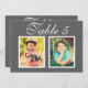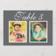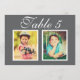 Elegant and unique custom wedding table number cards feature childhood photos of the bride and groom at an age that corresponds with the table number. To customize: type in the table number, click "change" by the default photos to upload your own digital or scanned photos, and add that individual table number card to your shopping cart. Repeat for all of the table numbers that you need. White script custom text on a dark charcoal grey (can be customized) background colour.