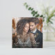 An elegant wedding photo thank you card in a unique square shape. It has a sample thank you message on the back of the card that you can edit or use as written and simply personalize with your names. Load a favorite photo in place of the sample photo shown in the design template. Square photos work best in this layout. This card is a wonderful way to share a favorite wedding photo with your friends and family who attended your wedding or sent a gift.