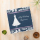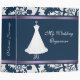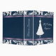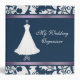 Avery three ring Binder with pretty graphics of a federal blue and white damask design on top and bottom edged with a lavender satin looking ribbon. In the middle of this pretty binder is a lovely wedding gown on an ornate stand against a solid federal blue background, text reads My Wedding Organizer. Great as a wedding scrapbook, organizer, or wedding photo album. Add your name or your own text to personalize just for you or as a gift. Get the type of inserts you need from local discount and office supply stores.