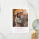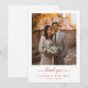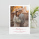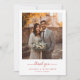 This is a romantic style image featuring a beautifully dressed couple standing together in an outdoor setting, bathed in warm golden sunlight. The bride holds a stunning bouquet of white and green flowers, while the groom stands beside her in a stylish suit. The background showcases historic stone architecture, adding a touch of timeless elegance to the scene. At the bottom, "thank you" is elegantly scripted in red, followed by the names Lauren & Benjamin and their location, Atlanta, Georgia. It exudes warmth, gratitude, and celebration, making it perfect for expressing heartfelt thanks to guests after a wedding.