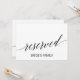 This elegant white and black calligraphy "reserved" sign is perfect for a simple wedding. The card is double sided (prints on both sides). The neutral design features a minimalist card decorated with romantic and whimsical typography. Use these cards to reserve chairs or tables at your wedding ceremony, reception or any event.