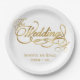 A formal, elegant white wedding paper plate with faux gold calligraphy script.