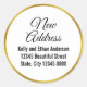 This white and faux gold change of address sticker can be personalized with your desired text (shown: New Address). The text is black. The first two lines are in an elegant black script. The faux gold border is not foil.