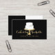 An elegant tiered white cake decorated with white flowers sits atop a faux gold cake stand for a beautiful aesthetic on this bakery or cake decorator's business card template. Update the calligraphic text with your name or business name for an instant logo. The double-sided design allows plenty of room for your information on the backside. © 1201AM CREATIVE