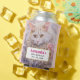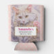 Can cooler with a lovely illustration. A long haired white cat looking regal and elegant. Surrounded by pink flowers, gold and diamond jewellery. Peach polka dot background.