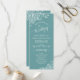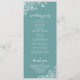 This beautiful wedding program features an elegant design with white text on a teal, turquoise, or aqua coloured background and lacy white curls and swirls in the corners. The titles are written in fancy script calligraphy, and there is space for your ceremony and wedding party details, as well as a short thank you for your guests. Wonderful way to welcome your friends and family to your wedding celebration.