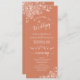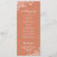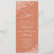 This beautiful wedding program features an elegant design with white text on a terracotta, coral, or light orange coloured background and lacy white curls and swirls in the corners. The titles are written in fancy script calligraphy, and there is space for your ceremony and wedding party details, as well as a short thank you for your guests. Wonderful way to welcome your friends and family to your wedding celebration.