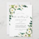 This elegant white floral schedule of events wedding invitation is perfect for a classic destination wedding. The modern vintage design features beautifully romantic ivory and cream watercolor rose and peony flowers with dark green leaves, greenery and botanicals. Include the invitation to your wedding on the front and a wedding weekend timeline on the back.