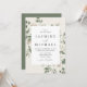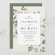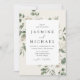 The elegant white floral wedding invitation features your names and wedding details framed by painted watercolor eucalyptus leaves, lush green foliage, white and cream roses, and lisianthus flowers.
